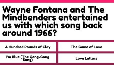 4/10 is the score to beat in this 1960s Songs quiz to put yourself over the average quiz taker. But you're probably going to be able to answer questions "Stevie Wonder entertained us with which song back around 1967?" and "Wayne Fontana and The Mindbenders entertained us with which song back around 1966?" easy!