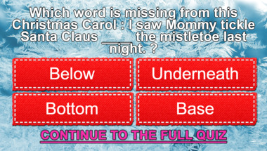 In this fun trivia quiz we're going to ask questions like "Which word is missing from this Christmas Carol : "The ____ and the ivy, when they ar.." and "Which word is missing from this Christmas Carol : "I saw Mommy tickle Santa Claus ___..".