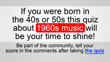 7/10 is what people on average are scoring in this 1960s songs quiz so far. Are you ready to answer questions like "Who sang this song : "My Heart Has a Mind of Its Own" around 1961?" and "The hit lists of 1966 contained this song from The Beatles"
