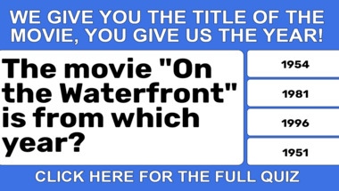 In this fun trivia quiz we're going to ask questions like "The movie "Singin' in the Rain" is from which year?" and "The movie "On the Waterfront" is from which year?".